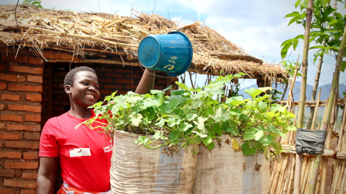 Phekenawo Esnart Phiri shows off her small innovative sack gardens utilizing a little space for vegetable producation in Dedza ⎮Photo: © GIZ