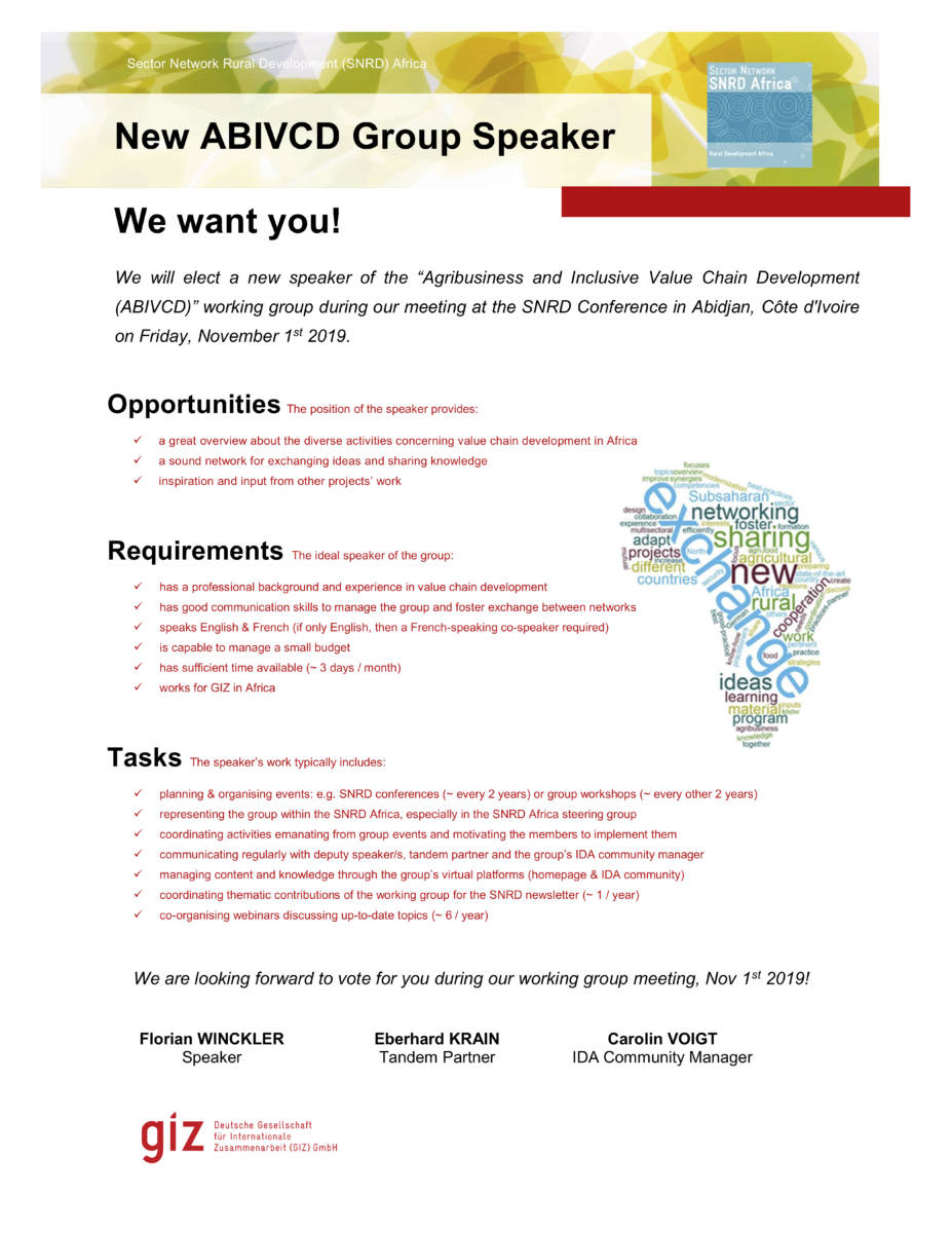 ABIVCD Working Group Is Looking for a New Speaker ABIVCD Working Group Is Looking for a New SpeakerColleagues interested in taking on this great opportunity, please find more information Download Pascal Corbé2019-08-13T15:15:01+02:00August 13th, 2019|Categories: Inclusive Agribusiness, UPDATES|