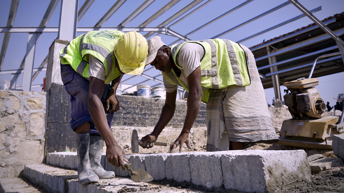 Two workers implementing comprehensive construction works at the auction yard, as part of the rehabilitation of the Husaihusa landing site to establish the framework conditions for a hygienic working environment for fishermen and vendors Visual: © GIZ