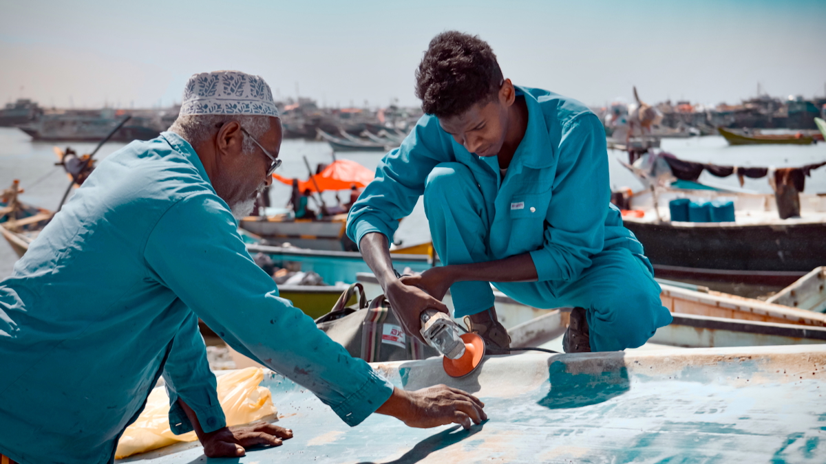 Trainer Noor Al-Dain Abdullag Ahmed Omar shows a young man how to repair a boat, during a training on boat repair in Ash Shihr, aiming to improve local service delivery, reduce costs for fishermen and provide income opportunities for trainees ⎮ Visual: © GIZ