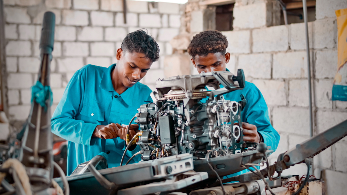 Two young men get hands-on training in boat engine maintenance, during a training in Broom & Mayfa’a district, aiming at providing livelihoods along the value chain and reducing costs for local fishermen ⎮ Visual: © GIZ