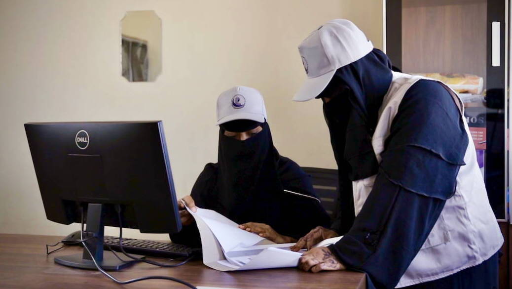 Two members of the women section of the Al Mukalla fishermen cooperative working on a practical exercise of an administrative skills training, provided by the GIZ SRPL project together with the office equipment, to enhance their management capacities ⎮ Visual: © GIZ
