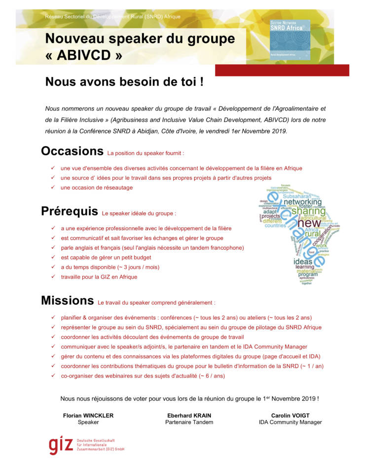 Le groupe de travail ABIVCD recherche un nouveau président Le groupe de travail ABIVCD recherche un nouveau présidentCollègues intéressés à saisir cette opportunité, veuillez trouver plus d’informations Télécharger Pascal Corbé2019-08-13T15:43:33+02:00août 13th, 2019|Catégories : Agrobusiness inclusif, MISES À JOUR|