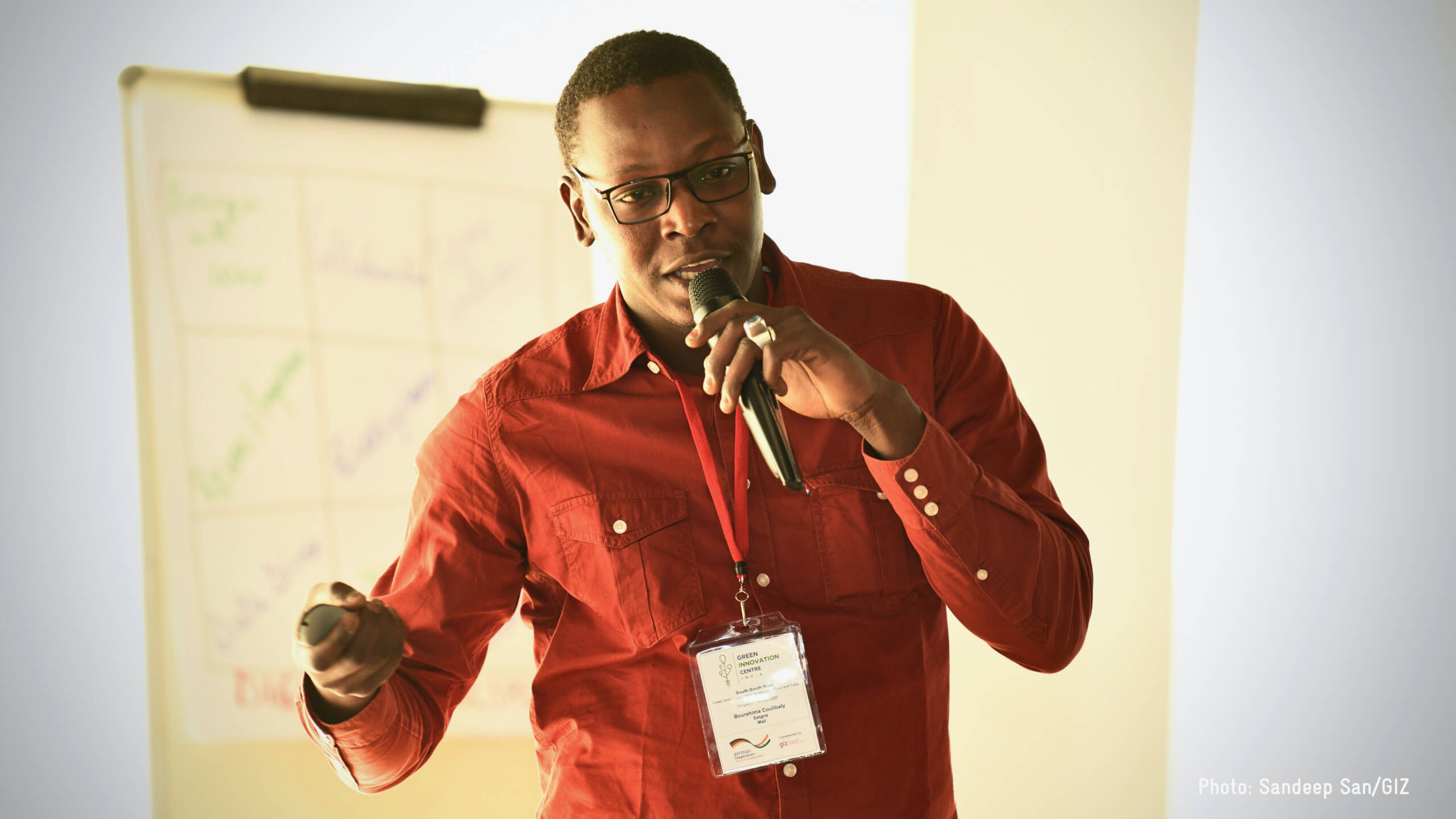 Handing over of the soil testing kit from Samuel from the Indian start-up Foundation for Environmental Monitoring to the Malian entrepreneur Bourehima Coulibaly